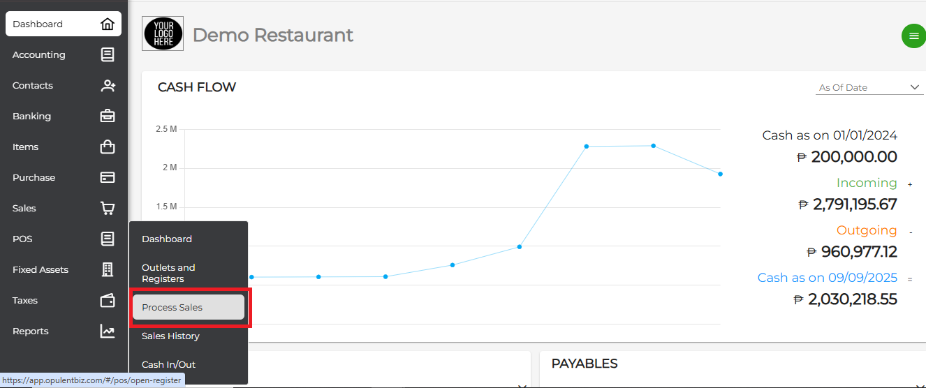 - Hover over the "POS" option in the side navigation bar. Click on "Process Sales from the dropdown menu. Alternatively, click on "POS", You will be directed to process sales.