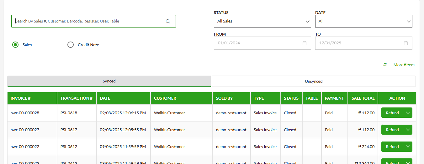 - Locate the sale you want to Void/Cancel. You have multiple filters to find the sales such as search it using the customer name, barcode, etc or you can filter it based on status of the sale, date.
