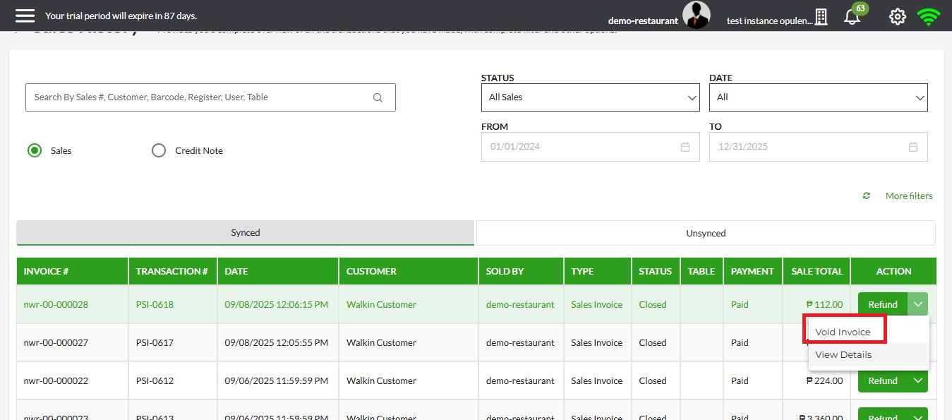 - After locating the sale, click on the dropdown attached to refund button and choose void invoice option and click on it.