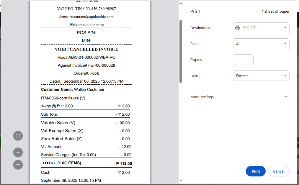 - After the invoice is successfully voided, the system will automatically print a receipt for the voided transaction.