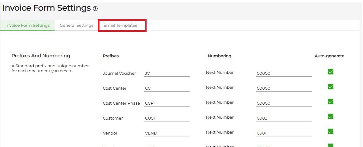 - Within the invoice form settings, Choose "Email Templates" Tab.
