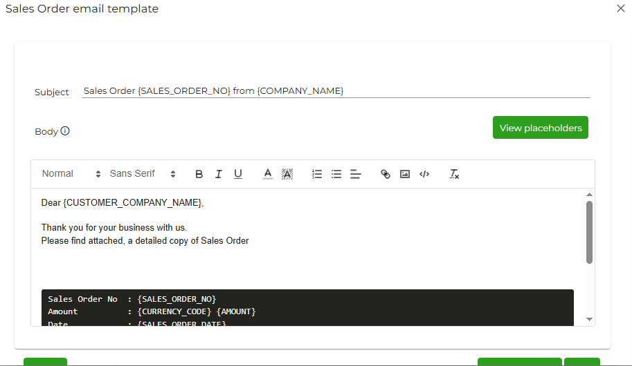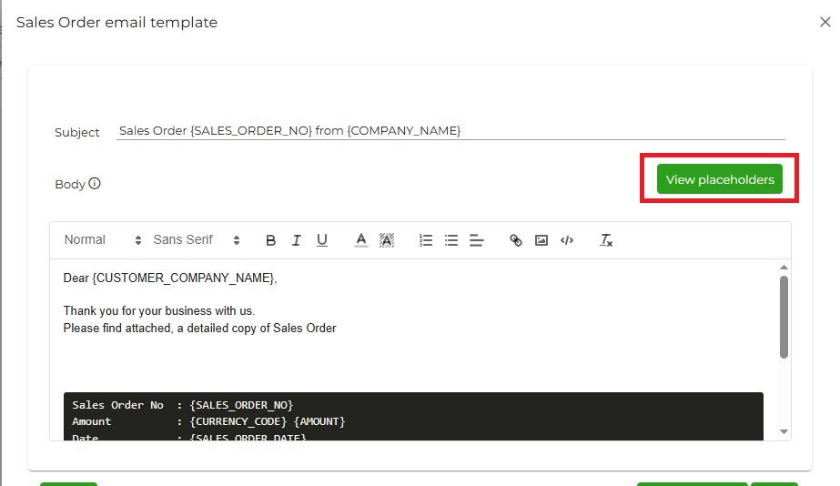 - To add any dynamic field (for example: invoice number, amount, customer name, etc.), click on the "View Placeholders" button.